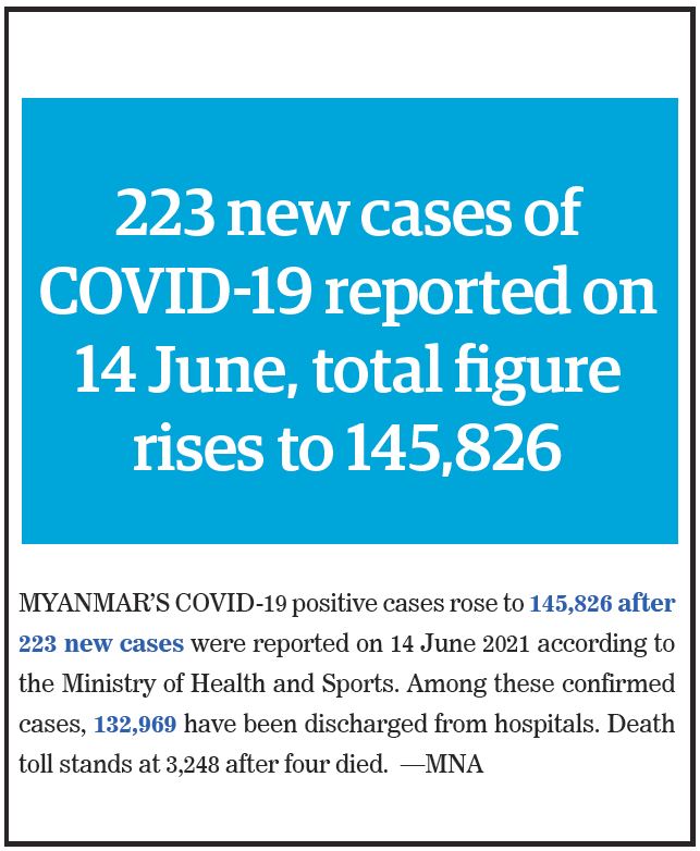 Submitted by moiuser on 15 June 2021 223 new cases of COVID-19 reported on 14 June, total figure rises to 145,826 #The_Global_New_Light_Of_Myanmar