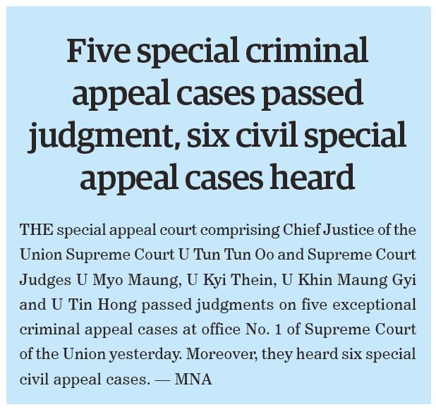 Submitted by moiuser on 15 June 2021 Five special criminal appeal cases passed judgment, six civil special appeal cases heard #The_Global_New_Light_Of_Myanmar