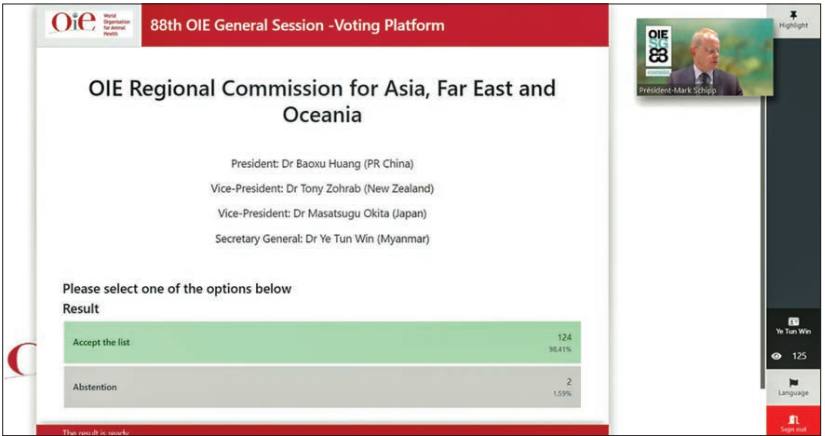 THE 88th General Session of the World Assembly of National Delegates of the OIE held from 24 and 28 May via videoconferencing in Paris of French. The assembly shared animal health information and discussed matters pertaining to animal health and welfare, measures to improve animal diseases, regulations to apply set by OIE for disease prevention in trading animal and animal products, and approved the OIE 7th Strategic Plan 2021-2025. Director-General for Livestock Breeding and Veterinary Department Dr Ye Tun Win joined the assembly.