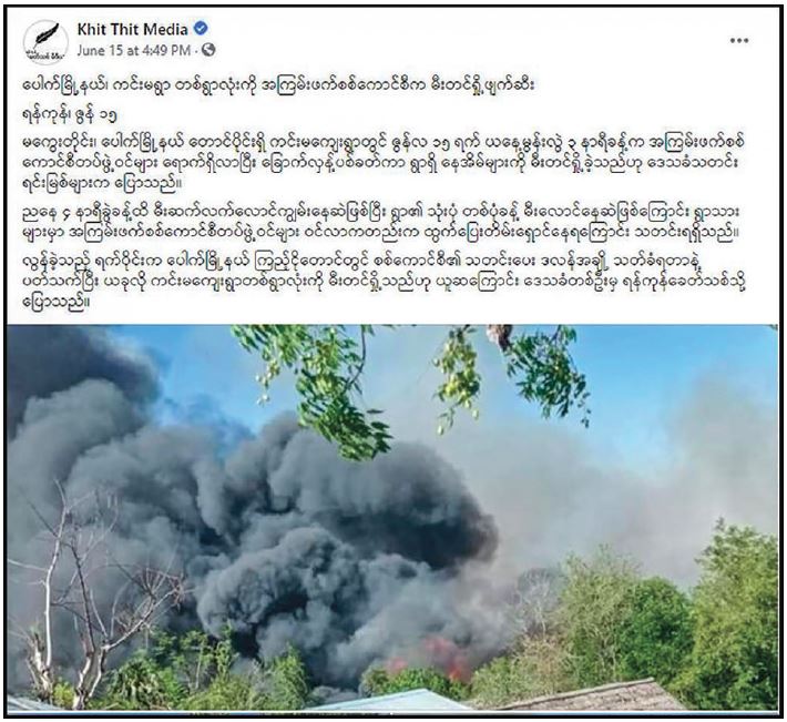 Among the news media, Khit Thit Media, whose business license has been suspended, reported the incident on 15 June at 4:49 pm on its Facebook account with the title “The whole village of Kinma was set on fire by the Terrorist Military Council.” The report said that about one-third of the village was still on fire by 4:30 pm and that the fire was still burning.