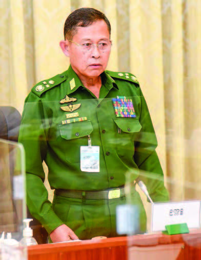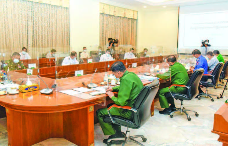 Participants of the meeting discussed testing, treatment and death in the disease, infection of disease in neighbouring countries, information for control of the disease, preparations for quarantine centres, preparations of the Tatmadaw to assist in treatment and control of the disease, supply of oxygen, directives for religious edifices, nunneries and monasteries to abide by the COVID-19 restrictions, vaccination for drivers and staff, providing social security assistance to infected workers, temporary closure of schools in stay-athome townships, distribution of aid for prevention of disease at the schools, systematic supervision for SOP/guidelines, giving health training to volunteers and provision of health aid.
