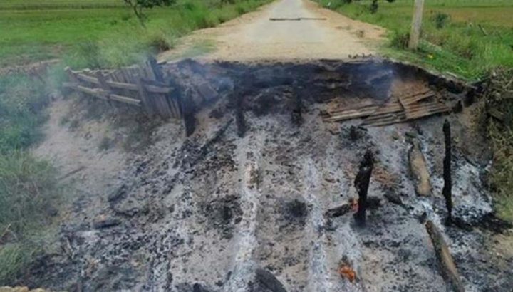 A 10-foot-long wooden bridge with a wide of 15 feet built on the road to Kinzedi pagoda from Naung Po Aung village was destroyed by the fire when the security forces arrived at the scene.