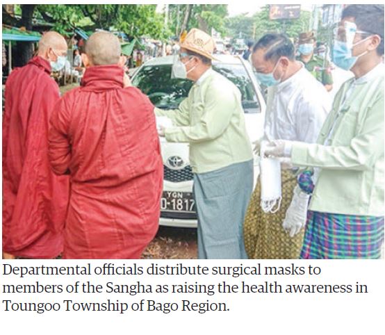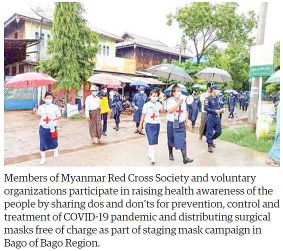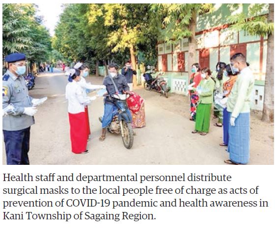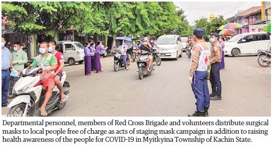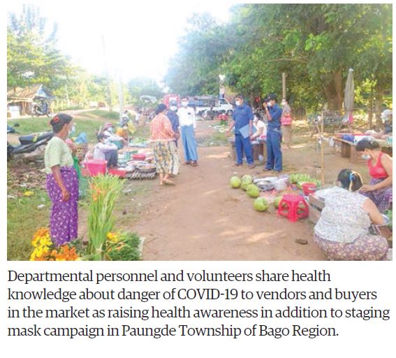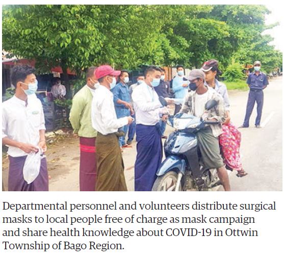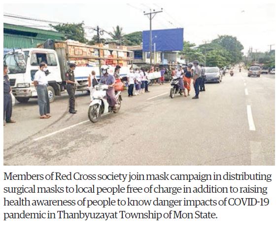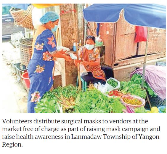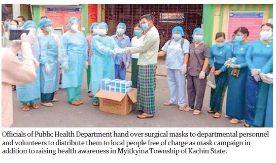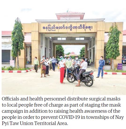 According to the instructions of the ministry, the Public Health Department of Nay Pyi Taw Council and respective regions and states raises the awareness of public health and stages the mask campaigns at the crowded places like markets, banks, junctions, bus stops and toll-gates by cooperating with the local authorities and those from relevant ministries, the Myanmar Red Cross Society, the Myanmar Maternal and Child Welfare Association, Myanmar Women’s Affairs Federation and volunteers.