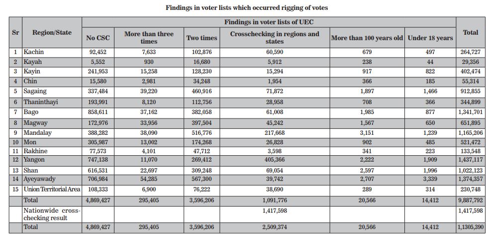 4. The previous Union Election Commission announced that 38,271,447 were eligible to vote in the 2020 Multi-party Democracy General Election and according to the scrutiny of the voter lists, the number of fraudulent ballots was 11,305,390 (29.54%) as follows: