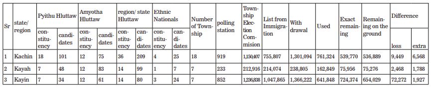 9. The findings on voter lists and ballot papers used for Pyithu Hluttaw in Kachin, Kayah and Kayin states were as follows;