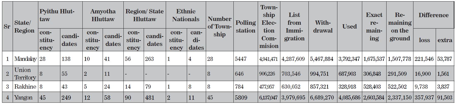 11. The findings on voter lists and ballot papers used for Pyithu Hluttaw Mandalay Region, Union Territory, Rakhine State and Yangon Region were as follows: -