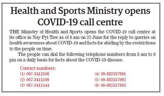 Submitted by moiuser on 27 July 2021 Health and Sports Ministry opens COVID-19 call centre #TheGlobalNewLightOfMyanmar