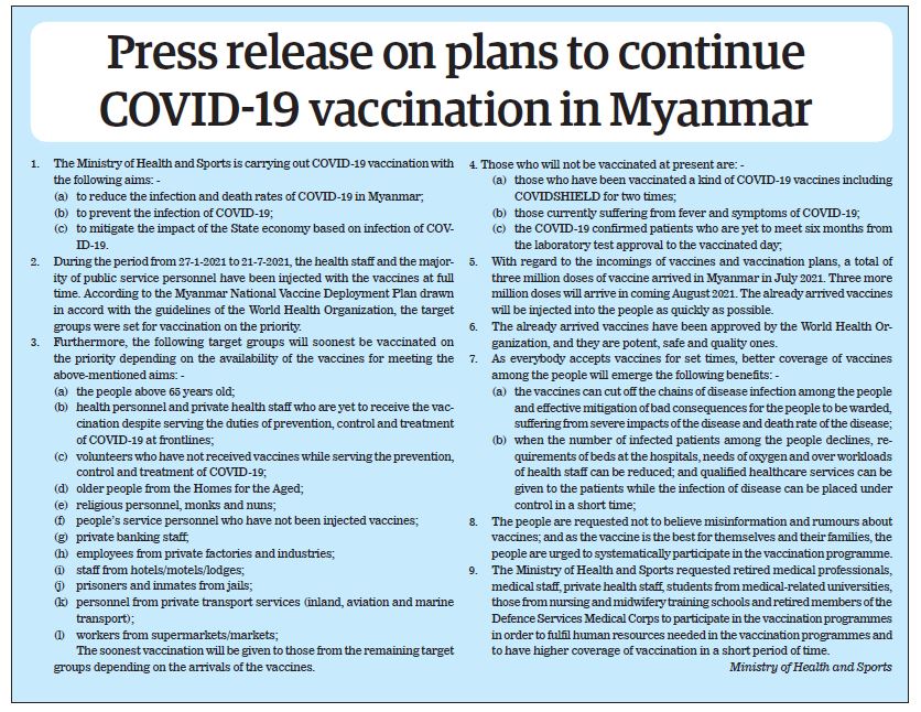 Submitted by moiuser on 29 July 2021 Press release on plans to continue COVID-19 vaccination in Myanmar #TheGlobalNewLightOfMyanmar