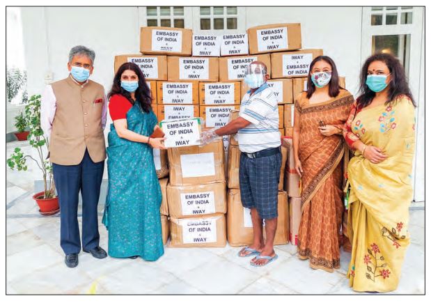 IN view of the serious Covid-19 situation in Myanmar which is causing a lot of pain and suffering to the people, the Embassy of India in collaboration with the Indian Women’s Association of Yangon (IWAY) as part of latter’s charity work will contribute medical supplies to the people to help them cope with the pandemic. This modest contribution, which is a token of friendship, includes oximeters (260), N94 masks (2,600), surgical masks (19,500), PPEs (1,300), paracetamol tablets (127,500), vitamin C tablets (65,000), Zinc tablets (39,000), and multi-vitamin tablets (65,000). These medicines and medical items will be distributed to around 130 villages in the Bago region through local bodies. Mrs. Smriti Srivastav, spouse of the Indian Ambassador and President of IWAY and board members, along with the Ambassador handed over the supplies for distribution at India House.