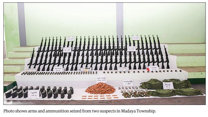 The security forces inspected the vehicle driven by Aung Ko Min form Tangataung Village together with Arkar Phyo in Panya Village of Madaya Township yesterday and seized the firearms including 60 K-22 guns, 11,000 bullets, 110 magazines, 85 Energa grenades, 80 hand grenades, 60 sets of equipment and 21 slings.