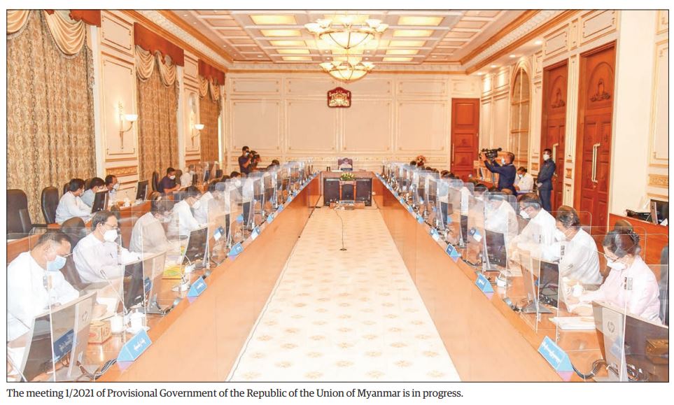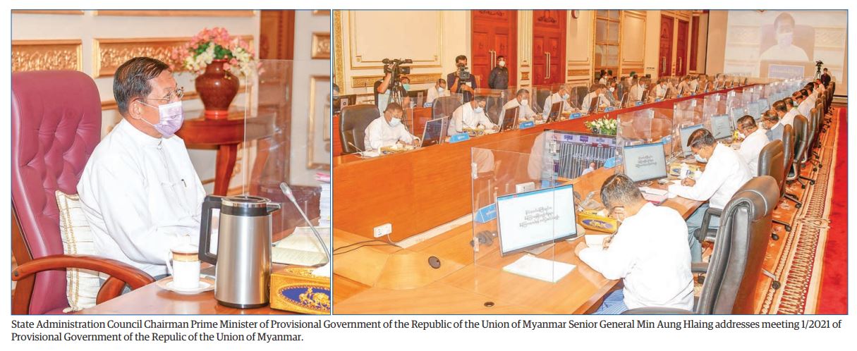 In his opening speech, the Senior General said the Provisional Government was constituted on 1 August, and he took the responsibilities of Prime Minister as the Head of Government. All cabinet members need to collectively carry out development tasks of the State. A government is responsible for undertaking improvement of the country. The Senior General stressed that they are not a political government with party policies but implement the fivepoint road map and nine objectives as policies adopted by the State Administration Council for the nation. It is necessary to secure achievement in implementing these policies. The tenure of the current government is a short time. He has explained it in the address delivered to mark the six months period of the government duty. The legal permission for incompletion of the tasks within the state of emergency period is mentioned in the chapter of the provision of the State of Emergency. Depending on management of the government and good cooperation of the people, the period for carrying out the tasks can be changed. Although the government takes responsibility for a short period, it is necessary to manage food, clothing and shelters of the people without fail. Likewise, efforts should be made for ensuring political peace and stability as well as security peace and stability Only when the country is peaceful and stable, can the election be held smoothly.