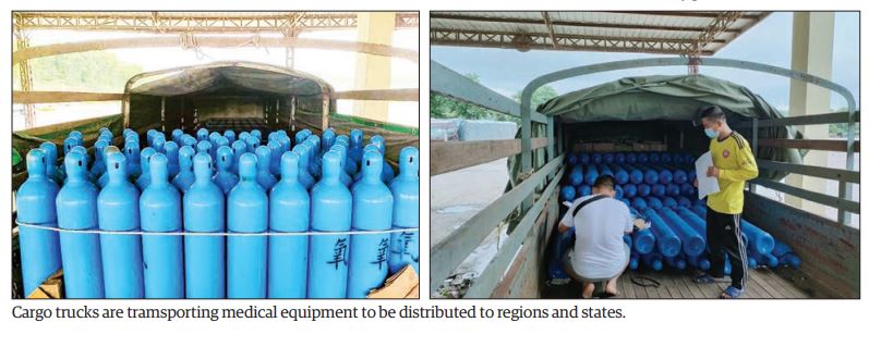 A total of 6,343 oxygen concentrators, 30 empty oxygen cylinders, 1,400 test kits, 1,000 PPE suits and 14 tonnes of masks arrived at the Yangon International Airport yesterday, while nine tonnes of liquid oxygen cylinders at the international port. Moreover, 38 tonnes of liquid oxygen on bowsers, 41 tonnes of liquid oxygen cylinders, 8,894 empty oxygen cylinders, eight oxygen plants, 7,495 home oxygen concentrators, 1,400 test kits, 20,600 PPE suits, 10 tonnesof gloves and 75 tonnes of masks were imported via Muse, Lwejel, Chinshwehaw, Myawady, Kanpaitee and Tachilek border trade checkpoints. These materials were transported by 61 vehicles of 39 companies.