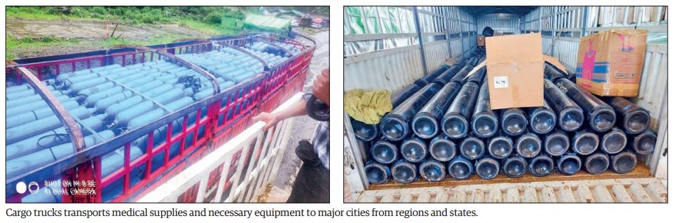 Yesterday, 30 empty oxygen containers and 1,944 oxygen concentrators were imported via aviation service at the Yangon International Airport. In addition, 79 tonnes of liquid oxygen, five tonnes of oxygen cylinders, one gas oxygen containers, three storage containers, 9,738 empty oxygen cylinders, 1,175 home oxygen concentrators, 40,680 PPE suits and 37 tonnes of masks were imported through border trade points.