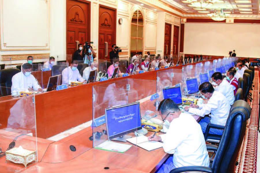 Members of the State Administration Council discussed taking action against those who provide money and equipment to CRPH, NUG and subordinate terrorist organizations and terrorists, rewarding the people who inform the authorities about the terrorists, taking action against USD manipulators, effective hindering the ethnic armed organizations which give training, arms and equipment to terrorists, use of AMI digital meters across the nation, measures of Kyaukpyu special economic zone, systematic formation of village people’s militia troops, the building of oxygen plant in Namhsam, prohibition for gold mining not to harm natural environment, and opening of an agricultural bank branch in Mabein.