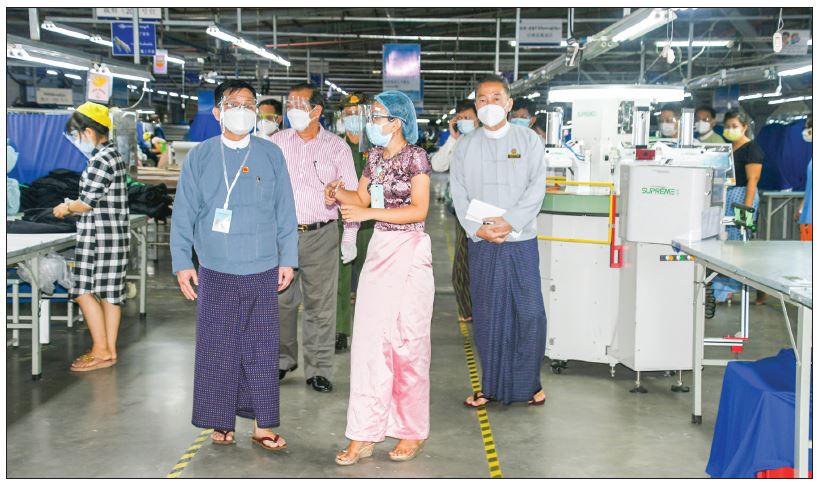 UNION Minister for Labour U Myint Kyaing and Yangon Region Chief Minister U Hla Soe visited Handa (Yangon) Garment Co., Ltd (Sport wears garment factory) in Shwelinpan Industrial Zone in Hlinethaya Township in Yangon yesterday morning and inspected the condition of the factory under the guidelines of COVID-19 preventive measures set by the Ministry of Health.
