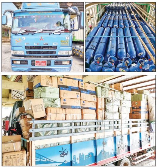 A total of 40 tonnes of oxygen (liquid) carried by two Bowsers, 77 tonnes of liquid oxygen, one storage container, 7,269 oxygen tanks, 317 oxygen concentrators for home use, 1,200 test kits, 3,877 sets of PPE suits, and 41 tonnes of masks were also imported via Muse, Chinshwehaw, Lwejel and Myawady trading posts and Yangon International Airport.