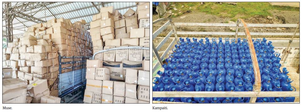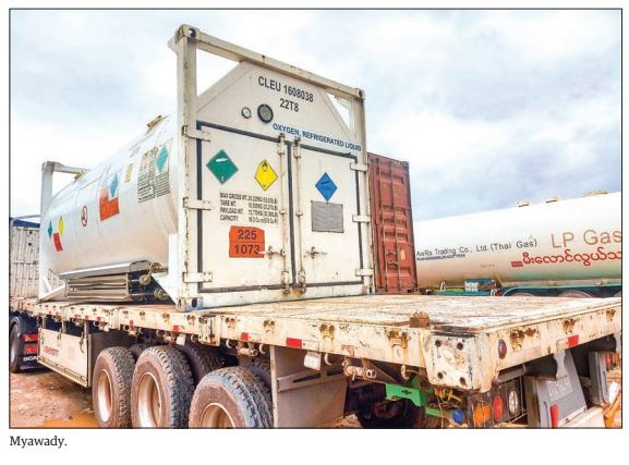 A total of 19 tonnes of oxygen (liquid) carried by two bowser three tonnes of liquid oxygen, 2,252 empty oxygen cylinders, one oxygen plant, 218 oxygen concentrators, 3,150 sets of PPE suits, and 80 tonnes of masks were imported via Muse, Chinshwehaw, Kampaiti, Myawady, Tachilek and Hteekhee trading posts and Yangon International Airport.