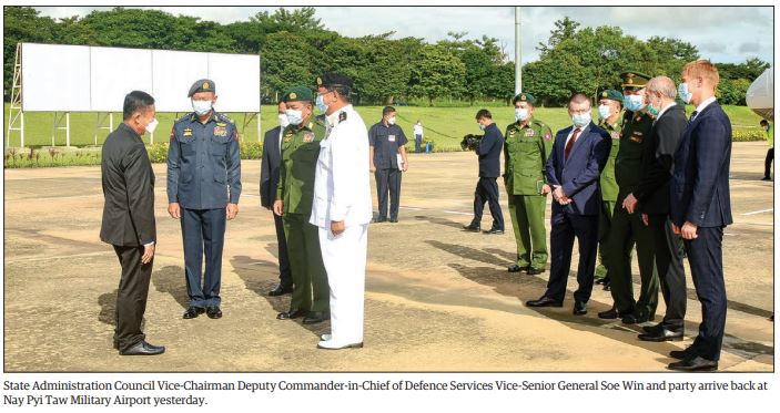 The Vice-Senior General and party arrived back at the Nay Pyi Taw Military Airport at about 8 am yesterday. They were welcomed back by members of the State Administration Council Commander-in-Chief (Air) General Maung Maung Kyaw, Chief of the General Staff (Army, Navy and Air) General Maung Maung Aye, senior military officers from the Office of the Commander-in-Chief (Army, Navy and Air), the commander of Nay Pyi Taw Command, Deputy Head of Mission of the Embassy of the Russian Federation to Myanmar Mr Pavel Klabukov and officials.