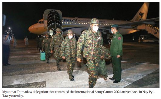 THE Myanmar Tatmadaw delegation which competed in the International Army Games-2021 held at the Congress Centre of the Patriot Park in the Russian Federation arrived back in Nay Pyi Taw yesterday morning and was welcomed back at Nay Pyi Taw Airport by Maj-Gen Ko Lay, Maj-Gen Zaw Lwin Oo and officials from the Office of the Commander-in-Chief (Army).
