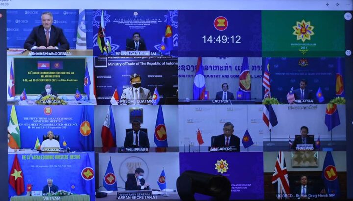 Union Minister for Investment and Foreign Economic Relations U Aung Naing Oo participated in the second day of the 53rd ASEAN Economic Ministers’ Meeting via videoconference on 9 September 2021 from the office of the Ministry of Investment and Foreign Economic Relations. The Meeting was chaired by Dato Dr Amin Liew Abdullah, Minister at the Prime Minister’s Office and Minister of Finance and Economy II of Brunei Darussalam and attended by ASEAN Economic Ministers (AEM), Senior Economic Officials (SEOM), Secretary-General of ASEAN Secretariat and representatives. During the meeting, the ministers noted the implementation status of the Priority Economic Deliverables (PEDs) of Brunei Darussalam under its ASEAN Chairmanship in 2021 and ASEAN Comprehensive Recovery Framework (ACRF) and urged the sectoral bodies to intensify the efforts for the timely completion of the ongoing works. The ministers exchanged views on economic policies in the context of sustainable development as a post-COVID-19 recovery strategy and acceleration of digital economic integration and endorsed the Bandar Seri Begawan Roadmap: An ASEAN Digital Transformation Agenda to Accelerate ASEAN’s Economic Recovery and Digital Economy Integration. In addition, the ministers noted and provided guidance on the recommendations of the High-Level Task Force on Economic Integration (HLTF-EI), the report of Chair of Senior Economic Officials’ Meeting and the report of Task Force Entry into Force of Future Provisions of ASEAN Economic Agreements. The ministers also discussed the preparation for ASEAN Economic Minister and its Dialogue Partners meeting with China, Korea, Switzerland, US, Hong Kong (China), India, EU, Russia, Australia, New Zealand, Japan, Plus Three (China, Korea and Japan), East Asia and the UK which will be held from 13 September to 15 September 2021. Deputy Minister U Than Aung Kyaw attended the morning session on behalf of the Union Minister. The Deputy Minister welcomed the progress of the Priority Economic Deliverables (PEDs) of Brunei Darussalam. He also supported the Bandar Seri Begawan Roadmap and suggested including the plan for capacity building and technical assistance in the implementation of the Roadmap taking into account the different levels of digital readiness and capacity. The Joint Media Statement of the 53rd ASEAN Economic Ministers’ Meeting was adopted at the end of the meeting. In the afternoon, Union Minister joined the launching ceremony of the OECD Competition Assessment and Competitive Neutrality Reports on the Logistic Sector in ASEAN via video conference. ASEAN Economic Ministers (AEM), UK Minister of State, Secretary-General of OECD, Secretary-General of ASEAN Secretariat and representatives participated in the ceremony. At the ceremony, Dato Lim Jock Hoi, Secretary-General of ASEAN gave the opening remarks. Dato Dr Amin Liew Abdullah, Minister at the Prime Minister’s Office and Minister of Finance and Economy II, Brunei Darussalam, Mr Mathias Cormann, Secretary-General of OECD, Rt Hon Greg Hands MP, UK Minister of State (Minister for Trade Policy) also delivered the remarks. After that, OECD handed over the reports to the ASEAN Economic Ministers. MNA #TheGlobalNewLightofMyanmar