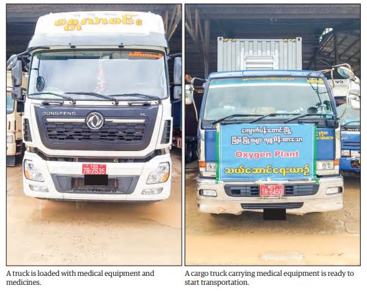 A total of 60 tonnes of oxygen (liquid) carried by three bowsers, 127 empty oxygen cylinders, four oxygen plants, 1,600 sets of PPE suits, 57 tonnes of masks were imported through Chinshwehaw, and Myawady border trade camps and the Yangon International Airport.
