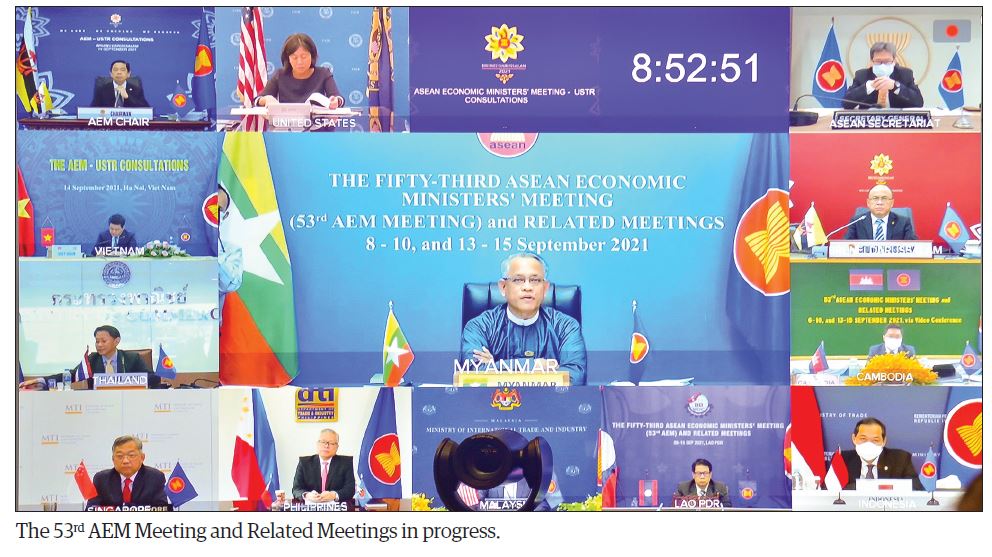 UNION Minister for Investment and Foreign Economic Relations U Aung Naing Oo attended the AEM-United States Trade Representative Consultations, 5th AEM-Hong Kong Consultations, 18th AEM-India Consultations, 17th AEM-EU Trade Commissioner Consultations and 10th AEM-Russia Consultations via video conferencing started at 7:00 am from the Ministry of Investment and Foreign Economic Relations, Nay Pyi Taw yesterday.