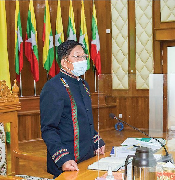 First, the Senior General and party were warmly welcomed by Kachin State Chief Minister U Khet Htein Nan, members and ethnic cultural troupe. The Senior General was worn in tradition[1]al costume. The Chief Minister of Kachin State reported on the progress of development tasks in Kachin State, the prevention and control of COVID-19, vaccination process and general matters, the Myitkyina District Administrator on respective matters, and town elders on requirements for development tasks.
