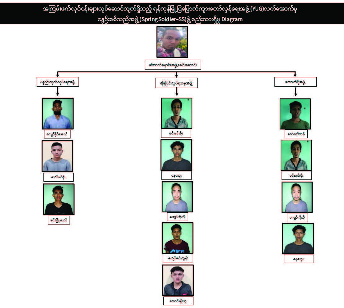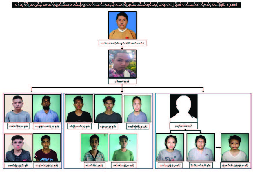 Nine extremists: Min Phyo Thaw, Nay Thway, Kyaw Ko Ko, Min Min Soe, Zaw Zaw Han, Thaw Zin Soe, Kyaw Naing Aung, Aung Myo Thu and Kyaw Min Tun formed the Spring Soldier-SS squad under Yangon Urban Guerrilla Revolution (YUG) group under the supervision of Min Thet Naung (aka) Saddam Gyi (aka) Beard (remaining to be arrested).