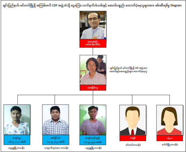 According to the findings on the investigation, Aye Nyein Thu, the main suspect of the case, has been providing health care service to the members of CDF, under the instruction of Zaw Wai Soe, fugitive of the NUG terrorist organization. He also collects donations from the donors in and out of the country to buy ammunition and medicines for CDF.