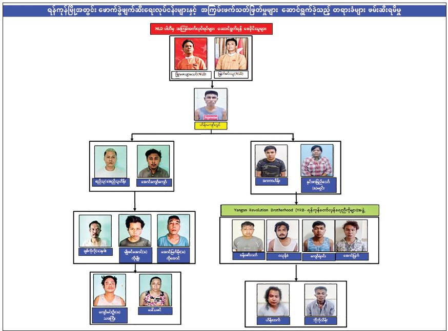 In order to conduct attacks in Yangon, the Yangon Revolution Brotherhood (YRB) was organized with Khant Zaw Latt, Ko Pee (aka) Nyein Chan (still at large), Wathone San, Kyaw Ye Win, Aung Myat, Htet Thura (still at large) and Saw Min Shein in the second week of June.