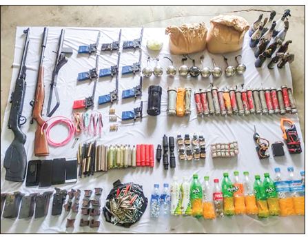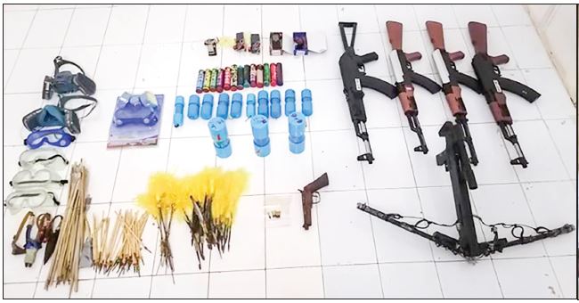 In this case, the police arrested a total of 16 suspects – 14 males and 2 females and seized 1 9mm pistol, 1 revolver, 4 airsoft guns, 14 homemade short barrel guns, 4 homemade long barrel guns, 1 crossbow, 12 electric fuse, 278 bullets, 1 grenade, 36 homemade mines, 4 keypad phones attached to mine, 125 grams of Ice, 7,500 WY tablets and other explosives.