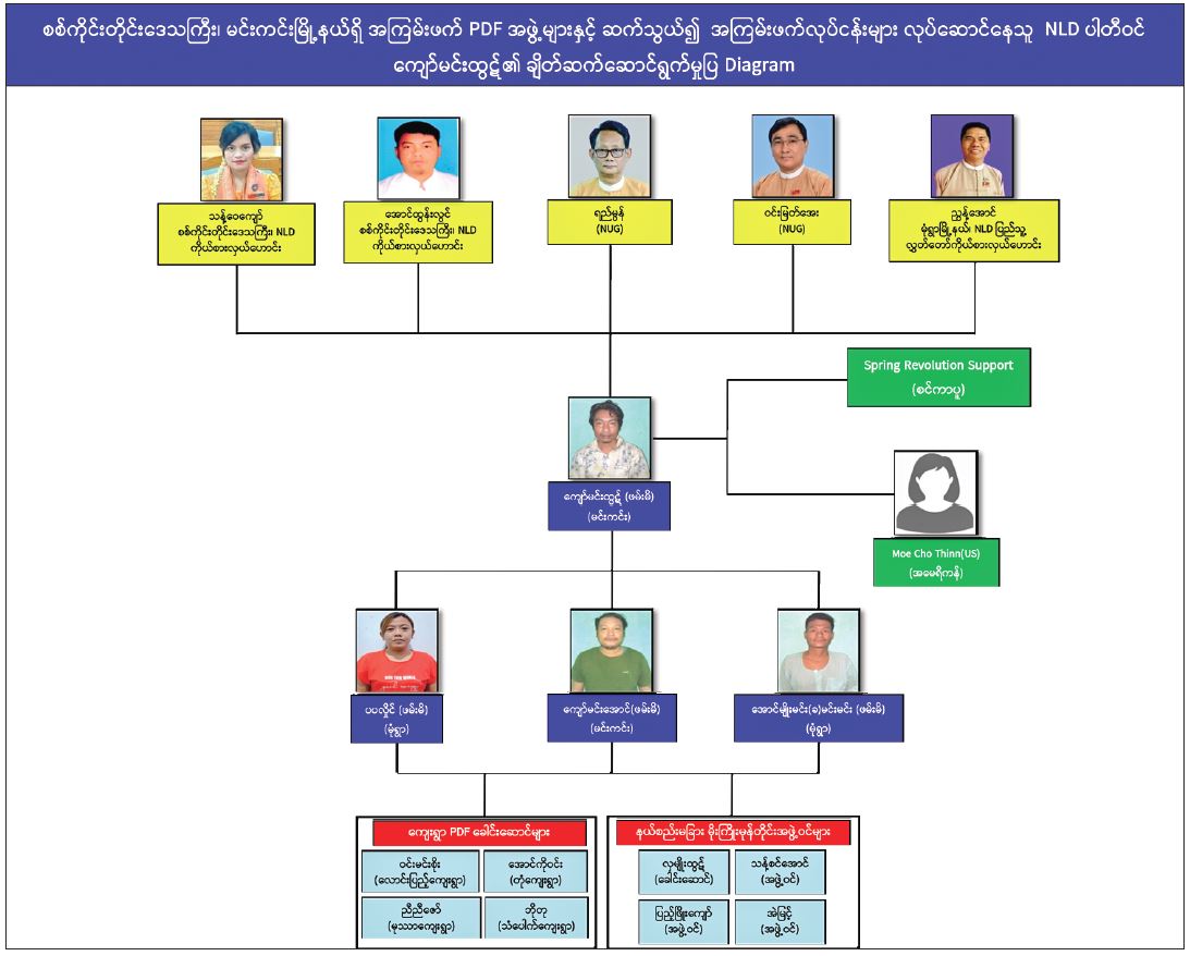 He contacted the Spring Revolution Support organized with another fugitive Nyunt Aung (former Monywa Pyithu Hluttaw MP of NLD), unlawful terrorist group NUG member Win Myat Aye, Moe Cho Thinn from the US and Myanmar nationals living in Singapore to collect money and allocated the cash contributions to PDFs and Thunderstorms Without Borders in Muttha, Tong and Thanpauk villages of Minkin Township where the innocent people were accused of being informers and killed.