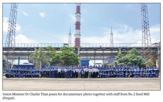 On 2 October, the Union Minister cordially met with staff from the No. (2) Steel Mill (Pinpat), and said the mill will produce iron and steel by using the domestic resources and it is necessary that all staff work together to timely complete the productions that support the development of the State and the industrial sector.