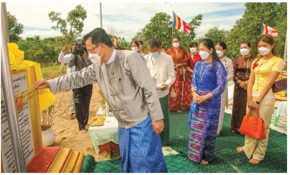 After receiving five precepts from the monks, Union Minister U Maung Maung Ohn and wife Daw Khin Swe Win and officials donated offertories to the Sayadaw and monks and presented water to the Buddha statues and Mahabodhi tree. Afterwards, the Union Minister and wife opened the stone inscription of the donation and concluded the ceremony.