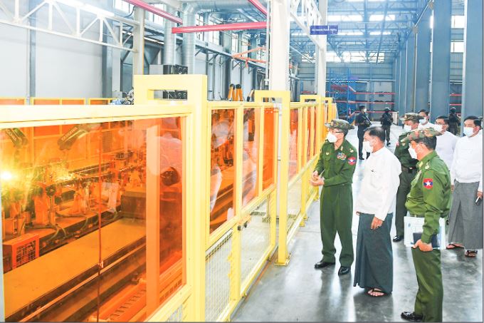 In his response to the reports, the Senior General stressed the need to manufacture a large number of quality automobiles such as oil bowsers, water tankers, garbage vans, sprayers and fire trucks not only for the Tatmadaw but for themunicipal tasks and fire-fighting tasks. Quality vehicles must be distributed to regions and states. Further research must be done for manufacturing the hightech vehicles meetingthe international standards.