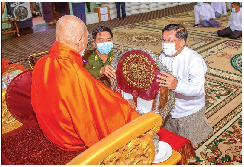 The Senior General offered eight kinds of prerequisites, cash for nine prerequisites, 100 bags of rice, 10 bags of gram, 100 visses of edible oil, nutritious foodstuffs and medicines donated by families of the Tatmadaw (Army, Navy and Air) to Bhamo Sayadaw. Members of the State Administration Council and Union ministers also donated alms to members of the Sangha.
