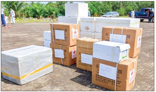 A total of 82,525 doses of Sinopharm vaccines for local people and 14,600 doses of Sinovac vaccines for school children and 17,000 pieces of syringes were handed over by the authorities at Myeik Airport, and received by Dr Yin Yin Nwe, Deputy Head of District Public Health Department, and distributed to townships in the district.