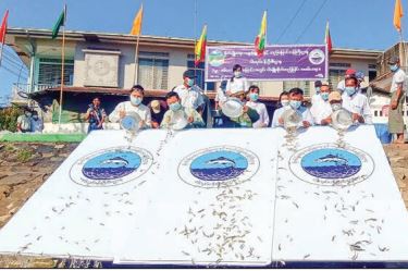 The Bago District Fisheries Department Head U Zaw Myint Naing, township administrator U Win Maw, township administration body member Major Myo Win Aung, Township Fisheries Department head Daw Khin Myo Naing and other relevant officials added a total of 630,000 newborn fishes — 350,000 Labeo rohita and 280,000 Barbus fish.
