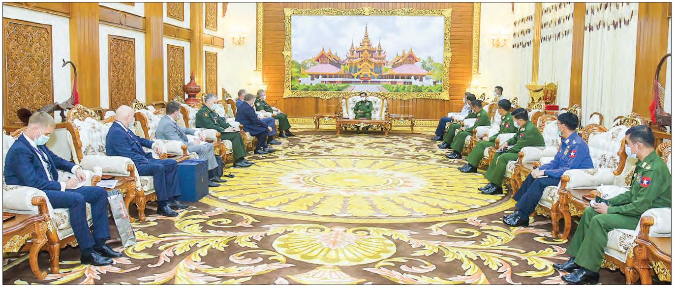 CHAIRMAN of the State Administration Council Commander-in-Chief of Defence Services Senior General Min Aung Hlaing received a delegation led by Chairman of the Russian-Myanmar Military Technological Cooperation Joint Commission Deputy Director of FSMTC of Russia Mr Vladimir Drozhzhov and Deputy Director-General of JSC “Rosoboronexport” Company Mr AL Chekmarev at the hall of Bayintnaung Villa in Nay Pyi Taw yesterday afternoon.