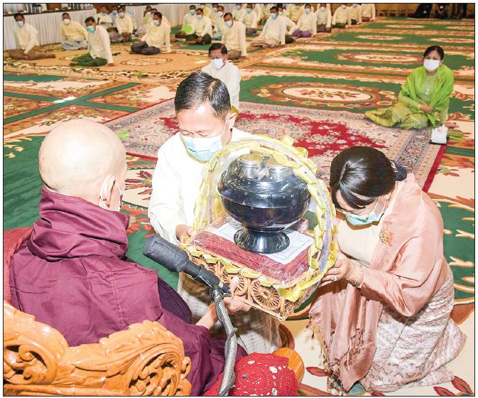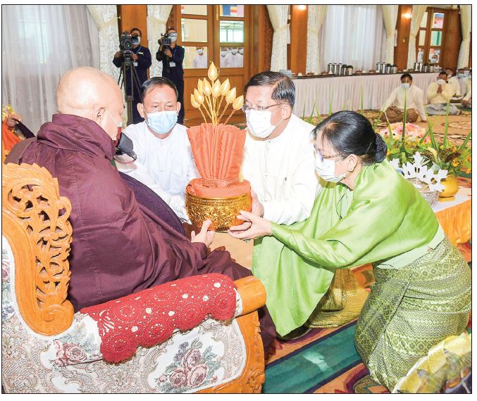 The Deputy Chairman of the State Administration Council Vice-Senior General and his wife offered Kathina robes and alms to Presiding Nayaka of Mingala Zayyon Monastery Bhaddanta Vimalabuddhi Parli Sayadaw. The members and Tatmadaw officers who attended the ceremony then offered Kathina robes and alms to the Sayadaws and Sanghas respectively.