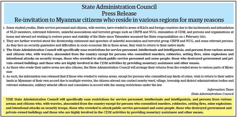 THE State Administration Council will specifically ease restrictions for service personnel, intellectuals and intelligentsia, and persons from various arenas and citizens who, with worries, absconded from the country except for persons who committed murders, robberies, setting fires, mine explosions and intentional attacks on security troops, those who crowded to attack public service personnel and some people, those who destroyed government and private-owned buildings and those who are highly involved in the CDM activities by providing monetary assistance and other means.