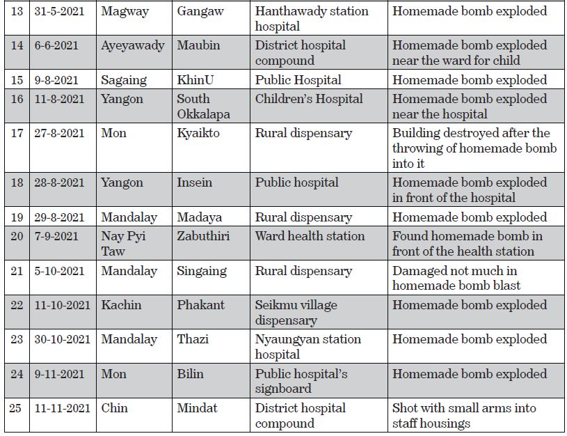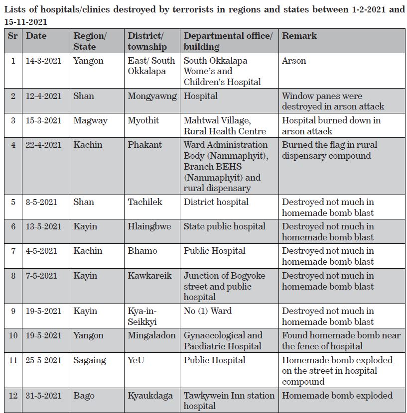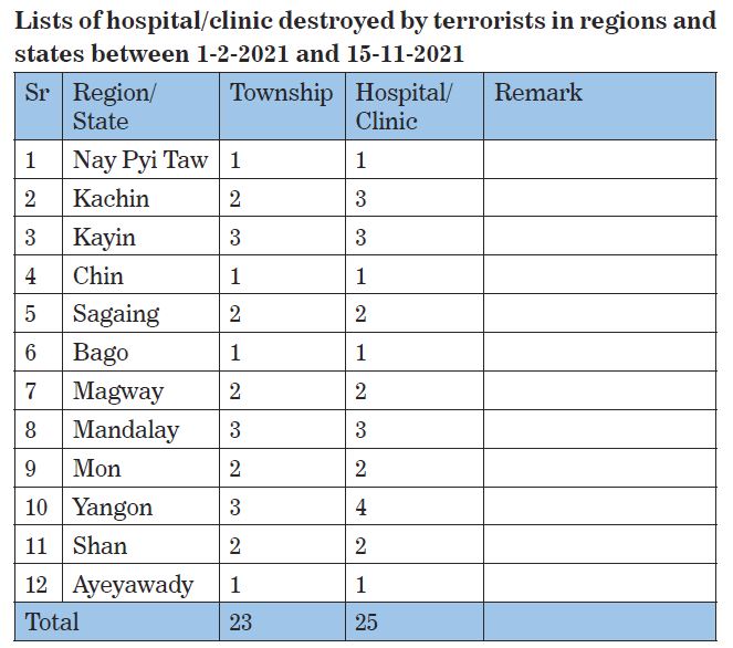 Terrorist groups, namely CRPH, NUG and PDF, do not wish to see harmonious cooperation among the government, the Tatmadaw, health staff and the people for uplifting the health sector, brutally killed health staff serving the State duties without any reasons and conduct bomb and arson attacks on the hospitals and clinics. During the period from 1 February to 15 November 2021, 25 hospitals and clinics were destroyed as follows:-