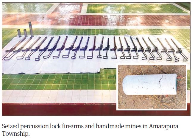 These two suspects admitted that they hid the homemade bombs and guns in the field of Pauk Inn, No (570) (b) owned by U Hsinywa Village in south of Thar Hla Aye Village of Tamotesoe Village-tract of Amarapura Township and the combined security team raided the pace and seized 23 homemade percussion lock firearms and one homemade bomb.