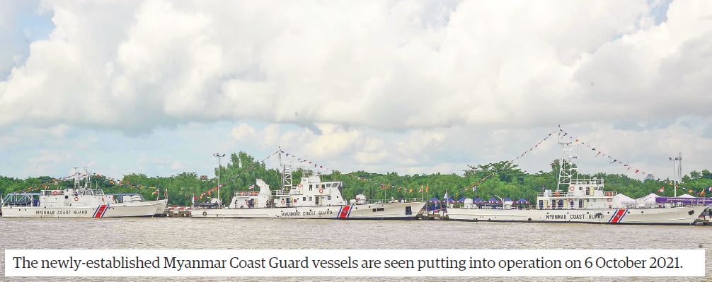 On 6 October, the Myanmar Coast Guard was constituted in a ceremony at No (3) Naval Jetty in Yangon, and coast guard vessels were commissioned into service. The Myanmar Coast Guard aims at (a) enhancing maritime security and the rule of law within Myanmar’s economic zones bordering its coastline, (b) protecting national maritime interests, (c) conducting search and rescue operations in seas, (d) combating crimes on Myanmar’s seas, (e) exchanging information with other coast guards and enhancing diplomatic relations with other countries, and (f) supporting the Tatmadaw Navy forces in conflicts.