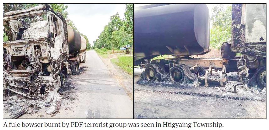 CRPH and NUG terrorists targeting to committing the utter devastation formed PDF terrorist group, murdering the people peacefully residing in some areas with various reasons, setting fire to and robbing State owned buildings, public hospitals, schools, housings, villages, markets, State owned banks and private banks.