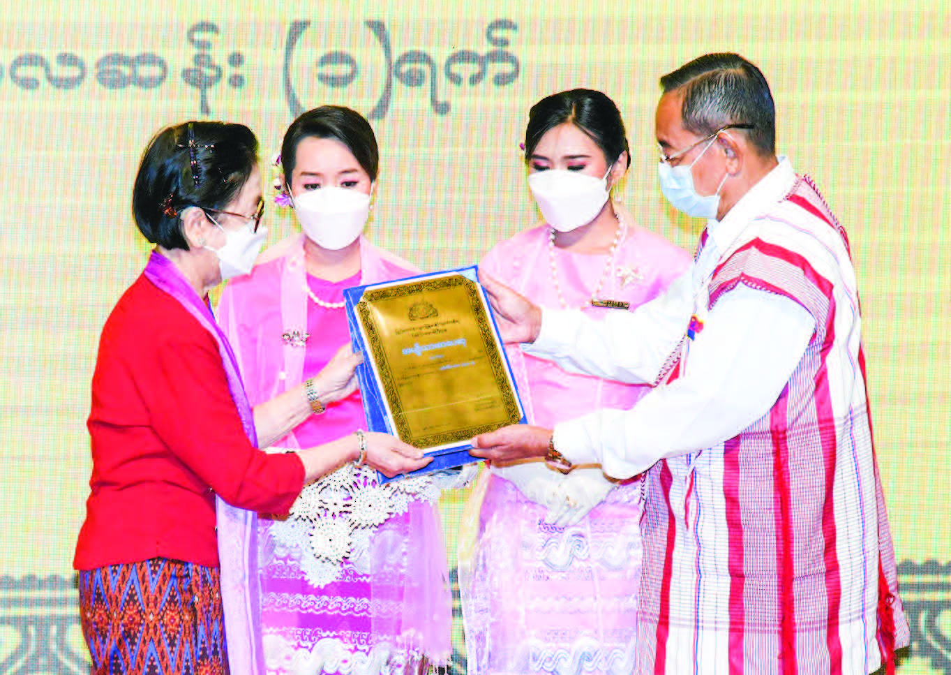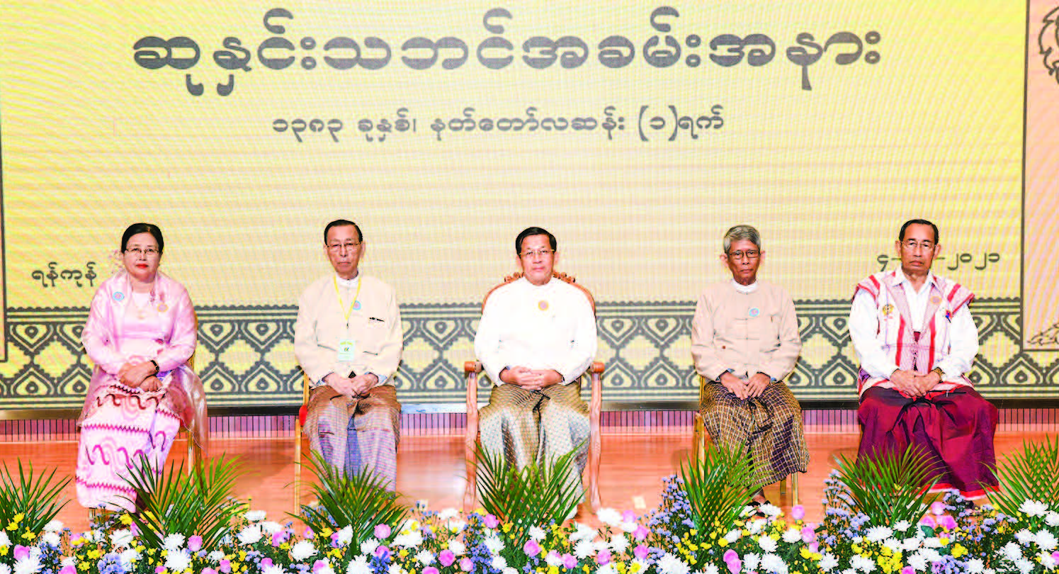 The Senior General presented the National Lifetime Award for Literary Achievement to veteran literati U Maung Maung Latt (Naung), U Sein Hlaing (Thura Zaw) and Daw Cho Cho Tin (Ma Sandar) for 2020, awards to writer Ma Chu Pwint in the novel genre, writer Chit Su Aung in classical poem genre, and writer Naing Zaw in Myanmar culture and fine arts genre through winners and their families.