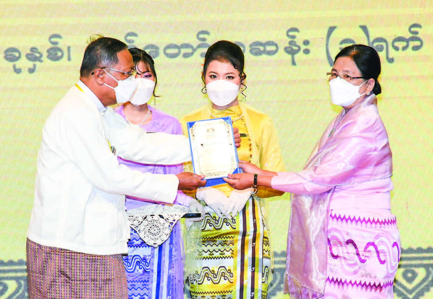 Then, SAC members Mahn Nyein Maung and Daw Aye Nu Sein presented national literary awards to winners. Union Minister for Information U Maung Maung Ohn, Union Minister for Religious Affairs and Culture U Ko Ko, Union Minister for Science and Technology Dr Myo Thein Kyaw, and Union Minister for Sports and Youth Affairs U Min Thein Zan presented winners in the Sarpay Beikman Manuscript Award.