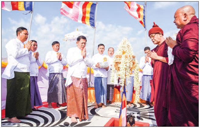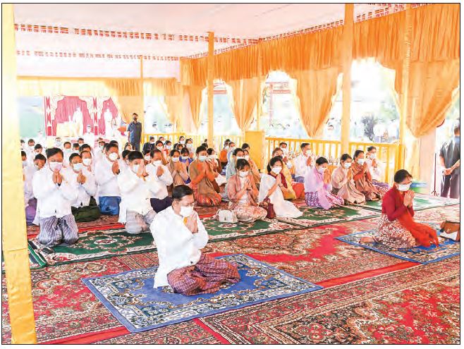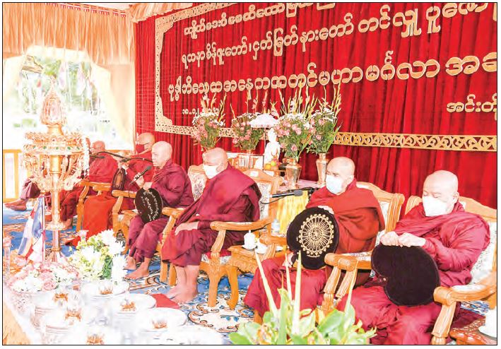 The Senior General and wife, and the congregation took the Nine Precepts from the Presiding Patron of Bahan Nyaungdon Monastery. Laypersons offered Paritta flowers, water, thread and sand to members of the Sangha. Next, the congregation listened to Parittas recited by members of the Sangha. The Senior General, wife and families donated diamond orb, pennant-shaped vane and alms to the Presiding Patron of Bahan Nyaungdon Monastery, and members of the State Administration Council, union ministers, and those presented donated alms to members of the Sangha.