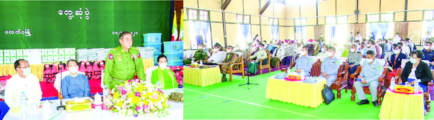 At Teinnyo Village IDP camp in MraukU Township, they provided 400 sets of school uniforms and 400 dozens of notebooks for students living in IPD camp and 894 bags of rice for 2,862 displaced persons. Then, they inspected the road expansion project in Lakkar Village of MraukU Township and construction of a 2-storey RC monastery and 323 houses in the village.