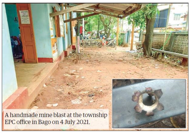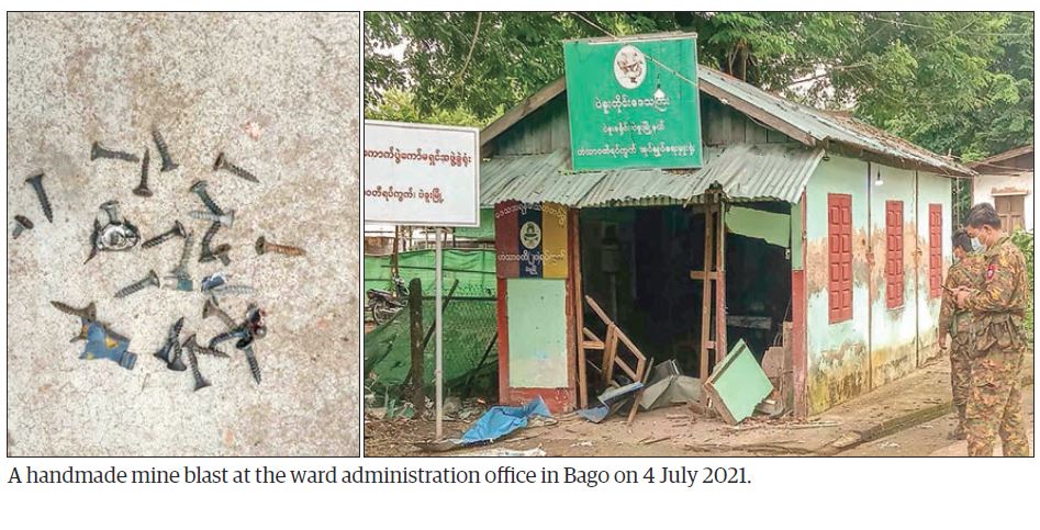 - Wai Yan Lwin and Aung Pyae Khant (still at large) threw homemade bombs into Zay Pine Ward's township EPC and Hanthawady ward administrator office of Bago on 4 July and Yan Naing and Nyein Chan (still at large) watched the condition of security forces for them to do so.